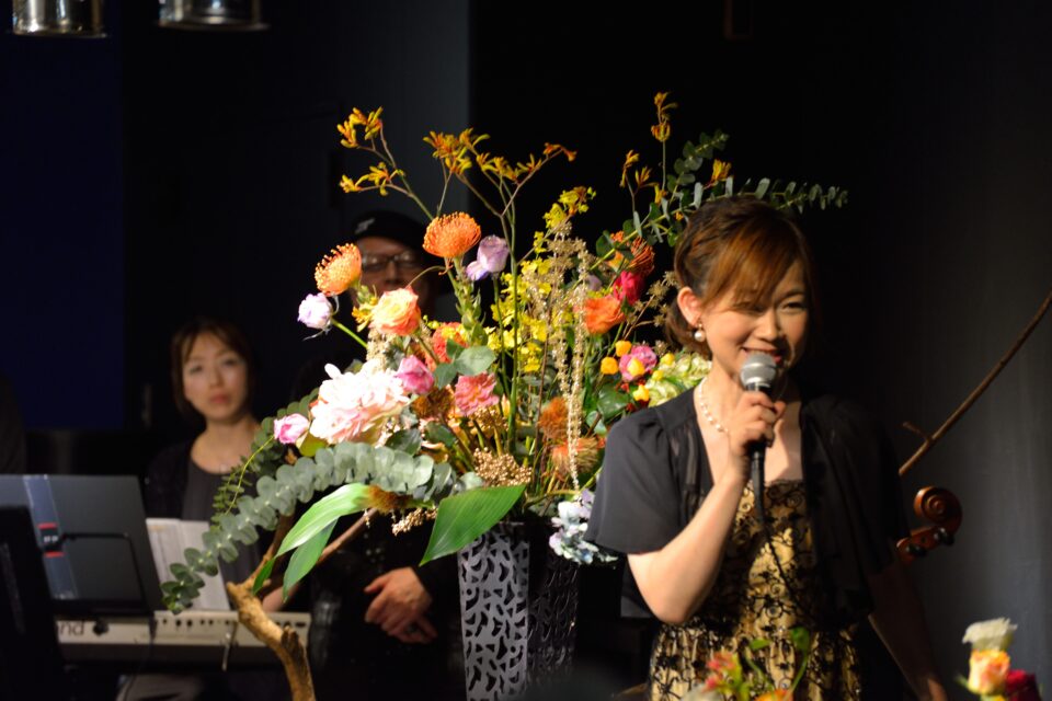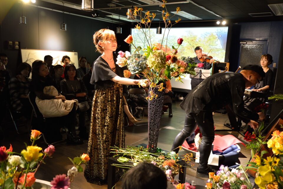 バイオリンなど、深層心理に響く楽器の生演奏に合わせて、その場のエネルギーを感じ、即興で花を生ける、フラワーセラピーを応用したパフォーマンスを行っています。通常のパフォーマンスイベントのようにあらかじめ設計はしないため、どのような作品に仕上がるかは誰にも分かりません。仕入れ時から花の声を聴き、場のエネルギーで生けていきます。すべてがドラマなライブパフォーマンスです。